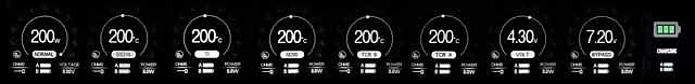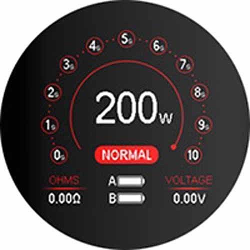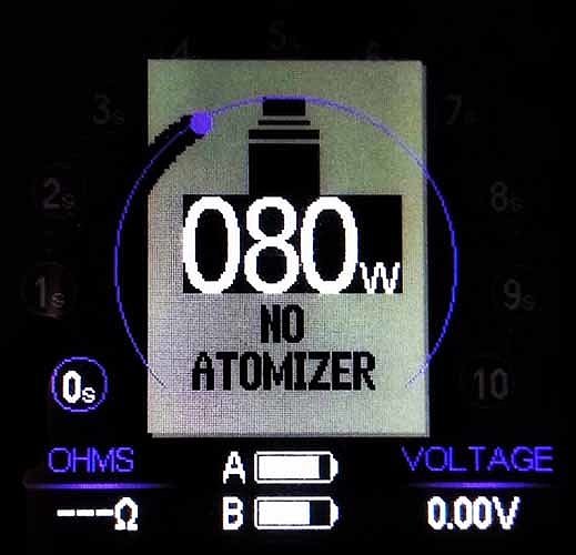 На дисплее отображается мощность, выбранный режим, вольтаж или градусы фаренгейта/цельсия, текущее сопротивление спиралей и показан заряд каждой из батареек.