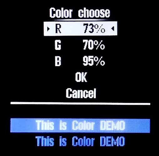 Реализована она путем регулировки процентного соотношения трёх основных цветов — Красного, Зеленого и Синего от 0 до 100.