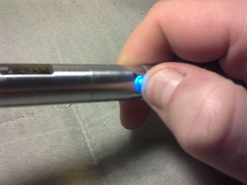 Итак, вернёмся к сигарете. Как где-то сказано в описании – имеет два режима работы: со стабилизированным напряжением и с напряжением, выдаваемом в зависимости от заряда батареи. Честно говоря, допёр как их переключать пока крутил в руках, да и в инструкции прилагающейся об этом ни слова. Плюс стабилизированного режима в том, что наглядно видна зарядка – при полной зарядке диод в кнопке, начиная с 50% - голубой, меньше 10% - синий. На фото – меньше 50%, но ещё не 10%.