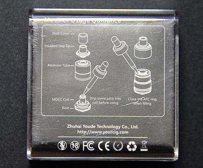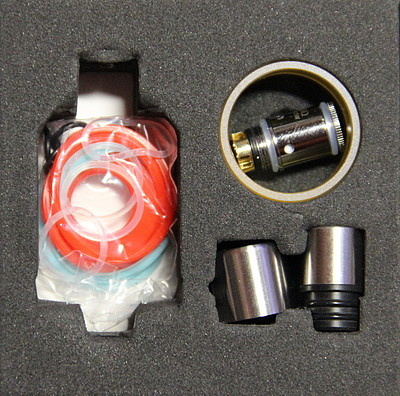 Внутри коробки лежит танк и комплект допов. К допам относятся: запасное стекло, 510 дрип тип, заглушка на дрип тип, запасной сменный испаритель и пакет уплотнительных колец. Один испаритель на 0,5 Ом изначально установлен в бакомайзер и чтобы начать парить, необходимо просто смочить испаритель и залить жидкость. Комплектация отличная, нету ничего лишнего, только самое необходимое.