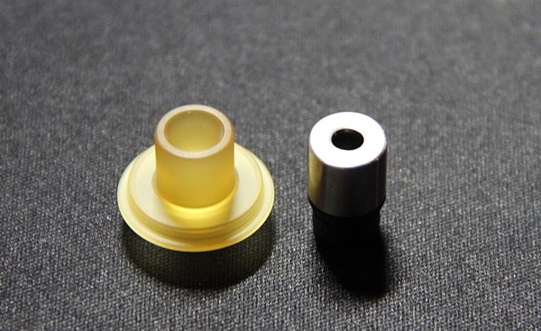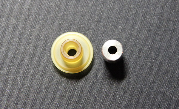 Сверху находится чаф кэп с 510-ой посадкой, выполненный, как я предполагаю из прозрачного матового термостойкого пластика. Чаф кэп отлично садится на крышку при помощи двух уплотнительных колец и полностью ее перекрывает, сделано это для уменьшения нагрева чаф кэпа. Из-за большей площади, тепло хуже передается, а так как сменные испарители бакомайзера работают на небольших мощностях, то он вовсе не греется.