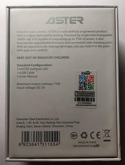 На основании коробки есть красочное описание боксмода Aster, комплектация коробки, сертификаты и соответственно код для проверки на оригинальность.