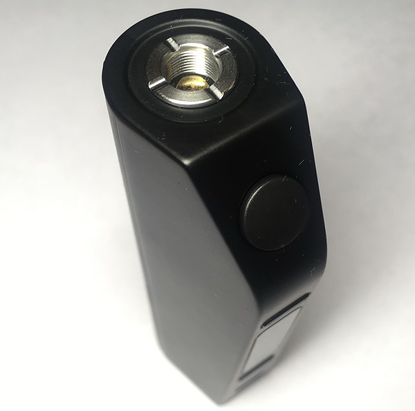 Сверху расположен 510 стальной коннектор и подпружиненный плюсовой контакт. Коннектор слегка приподнят относительно корпуса и поэтому при накручивании атомайзера есть зазор, сделано это для того чтобы атомайзеры не царапали корпус боксмода. Лично мне данное решение не очень нравится, так как при случайном падении может быть не только разбит бак, но и поврежден коннектор.