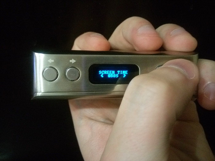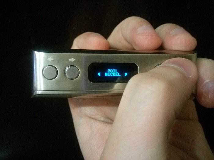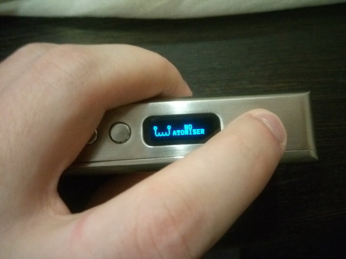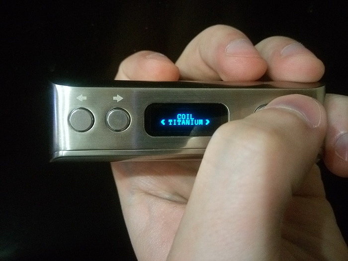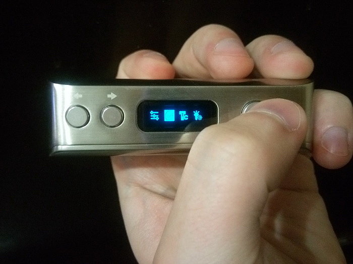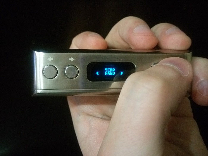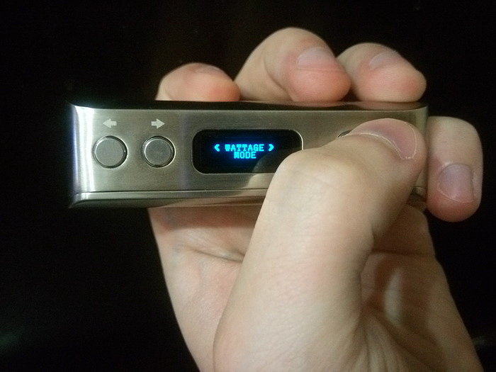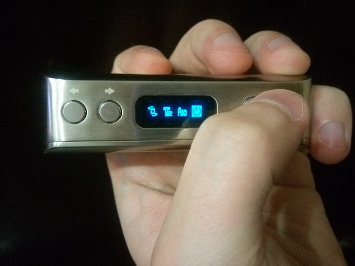 Управление. На лицевой стороне по стандарту имеются: кнопка fire, кнопки «+» и «-». Боксмод включается пятикратным нажатие на кнопку fire. Работает как в режиме вариватта, так и в режиме температурного лимитирования (термоконтроль). Мощность регулируется от 1 до 60 Вт с шагом в 0,1 Вт. Поддерживаемое сопротивление: в режиме вариватта от 0,1 Ома до 3 Ом, в режиме термоконтроля от 0,06 Ом до 2 Ом. Температура регулируется от 100 до 300 градусов Цельсия либо от 200 до 600 градусов по фаренгейту.