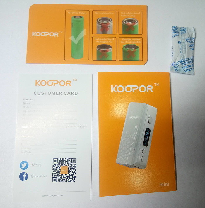 Комплектация. Когда мы открываем коробку, нас встречает боксмод Koopor Mini. Под ним лежит инструкция о том, какие аккумуляторы следует использовать (изолятор не должен быть сорван) – это ваша безопасность! Также мануал (инструкция) по эксплуатации, карточка покупателя и силиконовый чехол.