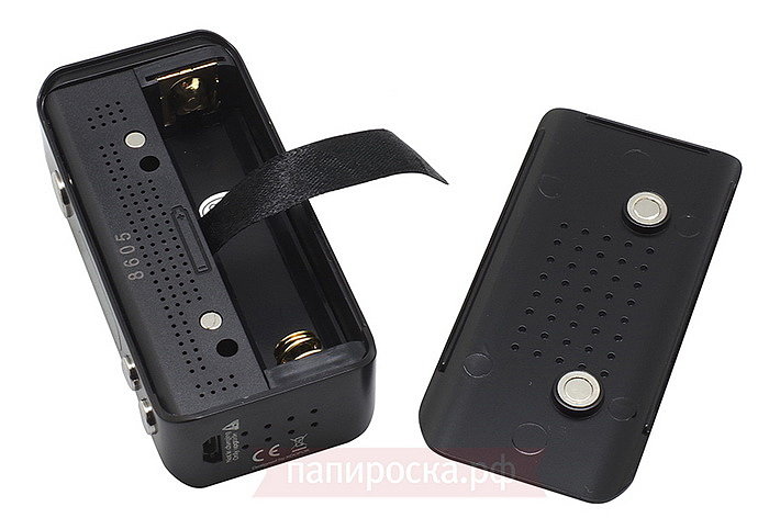 Не сказал бы, что крышка держится хорошо, из-за того, что снимается она слайдом вниз, крепление на корпусе не очень надежное. Она конечно же не будет слетать просто так, но если использовать устройство без чехла, то люфт крышки очень хорошо чувствуется. На крышке сделаны газо-вентиляционные отверстия, для вывода газов от аккумулятора и охлаждения платы. Сняв крышку, наблюдаем отверстие под один аккумулятор 18650, на корпусе проделаны вентиляционные отверстия и изображение, как правильно ставить аккумулятор. Аккумуляторы ставятся плюсом вверх. Для более удобной замены имеется ленточка, а минусовой контакт подпружинен. Пружинка довольно упругая, при замене будьте осторожны, чтобы аккумулятор не отлетел.