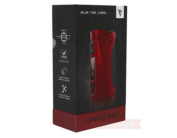 Сверху изображен Vaporesso Nebula, по бокам есть контактные данные, а также описаны основные преимущества данной коробочки. Такие как: очень умная плата с огромным количеством настроек, максимальная выходная мощность в 100 Вт, возможность работы как с аккумуляторами 18650, так и 26650, а также строгий и эргономичный внешний вид.