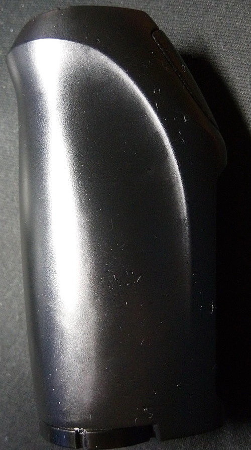 На основании есть крышка отсека под аккумулятор и отверстие micro USB. На крышке проделаны шесть отверстий для вывода газов и нанесено название производителя и устройства.