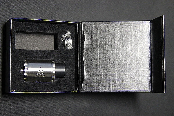 В самой коробке мы видим сам атомайзер. Должен быть также стандартный комплект с дополнительными орингами, синей маленькой отверткой, двумя преднамотанными спиралями и запасными винтами; а также адаптер под 510-й дриптип.