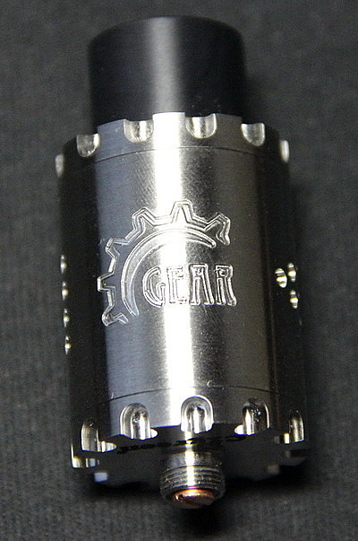 Рассмотрим девайс поближе. Дрипка выполнена из нержавеющей стали. Выглядит очень презентабельно: сама стальная, а чаф-кэп выполнен из делрина. Регулировка обдува очень грамотно выполнена и не дает дрипке "сопливить" и оставлять конденсат. По бокам написано название устройства «Gear», а также расположен забор воздуха, отверстия которого составляют треугольник. Высота устройства 46,5 мм. Диаметр 25 мм. Атомайзер очень увесистый и будет хорошо смотреться на больших боксмодах. Вес составляет немалые 74 грамма. При таком исполнении набор в целом может очень много весить, что не очень удобно при постоянных переносках. Но тут уже стоит выбирать между удобством и размерами и автономностью и вкусом.
