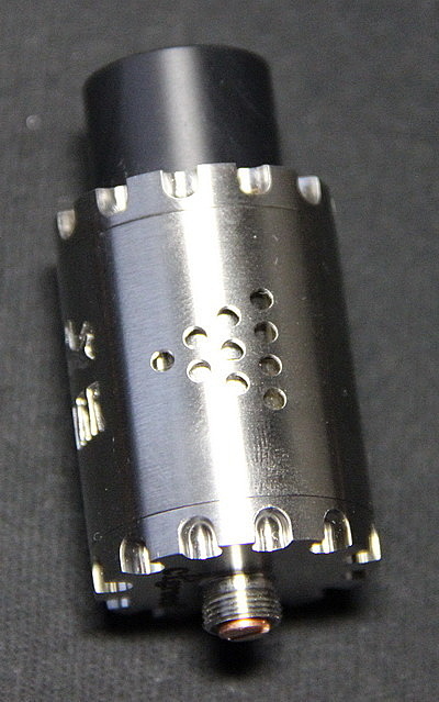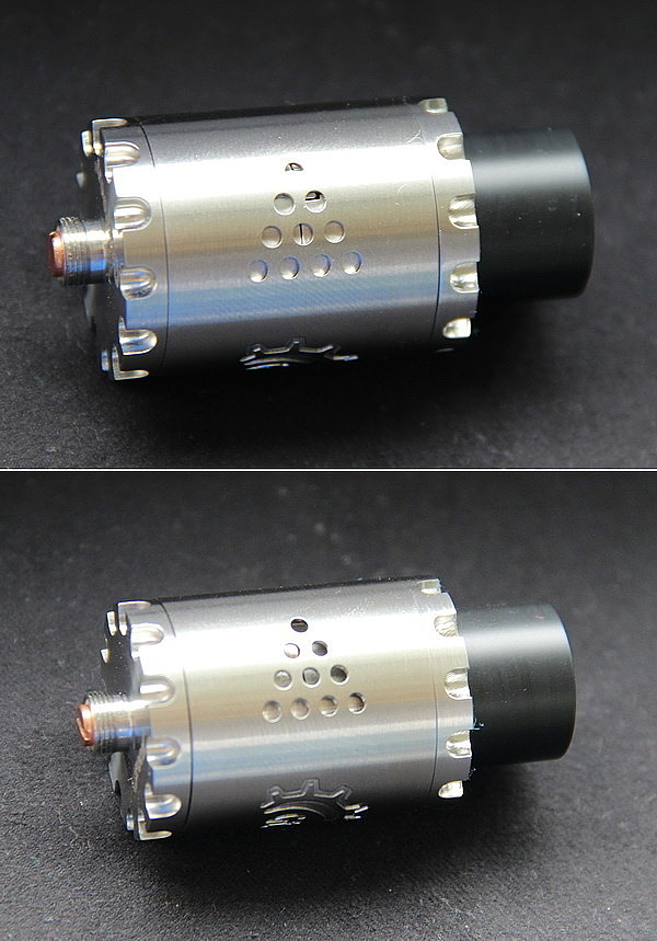Обдув регулируется прокручиванием центрального металлического кольца, что позволяет открывать/закрывать отверстия обдува с двух сторон. Если вы хотите тугую затяжку, то оставляете по одному отверстию с двух сторон, для легкой – оставляйте открытыми все отверстия. Данный дрип атомайзер предназначен исключительно для двухспиральных намоток, односпиральную намотку устанавливать нельзя.