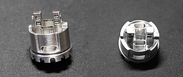 Внутри находятся Velocity стойки с очень широкими отверстиями, что позволит вам попробовать интересные намотки. Спираль держится на крестовых винтах, которые как по мне намного удобнее, нежели шестигранные винты. Ванночка у базы довольно глубокая – около 7-ми мм, так что при парении можно вообще забыть, что это дрипка. С данной ванночкой можно долго парить без частого закапывания.