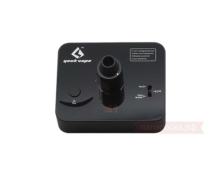 Лицевая панель выполнена из глянцевого пластика и, к сожалению, собирает на себе отпечатки пальцев. На ней также расположены: название производителя, кнопка прожига «fire», коннекторная площадка, тумблер переключения режимов, дисплей и аннотация к ошибкам, которые будут отображаться на дисплее. С боку нанесено название производителя, а на основании есть пластиковая глянцевая крышка (она также собирает отпечатки), две прорезиненные ножки, которые уверенно удерживают устройство на столе и не дают ему свободно перемещаться при установке спирали в атомайзер, аннотация о рабочих сопротивлениях, а также сайт производителя. Коннекторная площадка стальная с подпружиненным плюсовым контактом. Она приподнята относительно корпуса, а ее диаметр в месте посадки составляет 22 мм. Благодаря этому атомайзер не будет касаться корпуса и царапать его при накручивании.