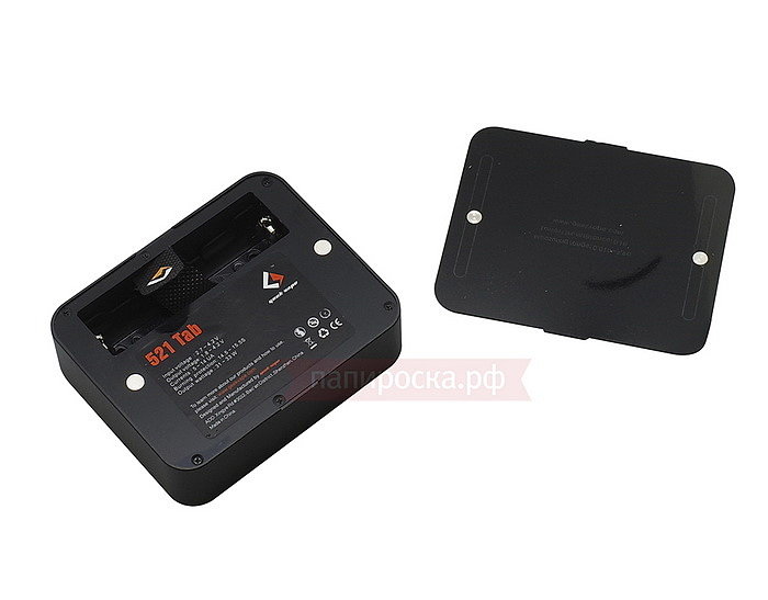 Под крышкой также есть название устройства и его аннотация, сайт производителя, сертификаты и отсек под аккумулятор. В отсеке под аккумулятор есть ленточка для более удобной замены. Также внутри написана информация каким контактом куда устанавливать и какой формат аккумулятора можно использовать. Плюсовой и минусовой контакт устройства выполнены в виде лепестков. Не стоит бояться, что со временем аккумулятор их продавит и их придется править, потому что лепестки жесткие и уверенно выдержат нагрузку установленного аккумулятора. А для того чтобы они не царапали изолятор аккумулятора, их конец загнут. Тем самым при установке и замене аккумулятора нет острых граней, которые могли бы его зацепить.