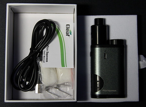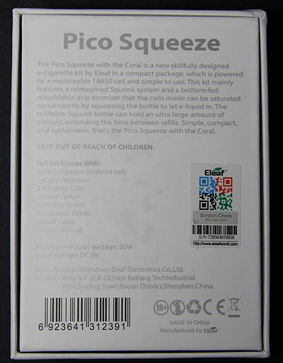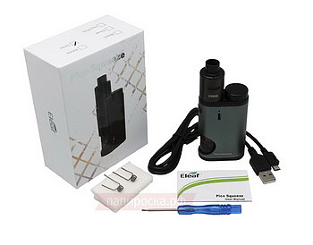 Eleaf Pico Squeeze + Coral RDA – это этакий стартовый комплект в варианте набора со сквонком. Как мы все знаем, сквонки это атомайзеры, у которых есть отверстие в плюсовом контакте для подачи жидкости и боксмоды с емкостью для жидкости, в виде бутылочки, нажимая на которую жидкость по плюсовому контакту атомайзера попадает в базу и пропитывает вату. Такие типы устройств не так часто встретишь, а некоторые комплекты стоят недешево. Поэтому для того, чтобы пользователь мог понять и разобраться что такое сквонк и нужен ли он ему вообще, компания Eleaf выпустила недорогой и простой сквонк набор. В этот набор входит боксмод с максимальной мощностью в 50 Вт и атомайзер с обслуживаемыми сменными базами.