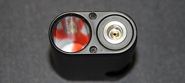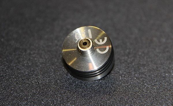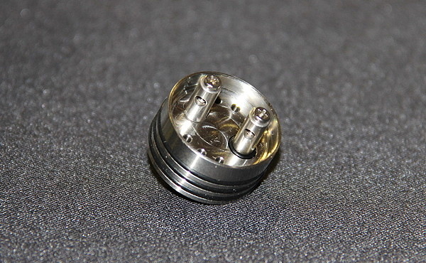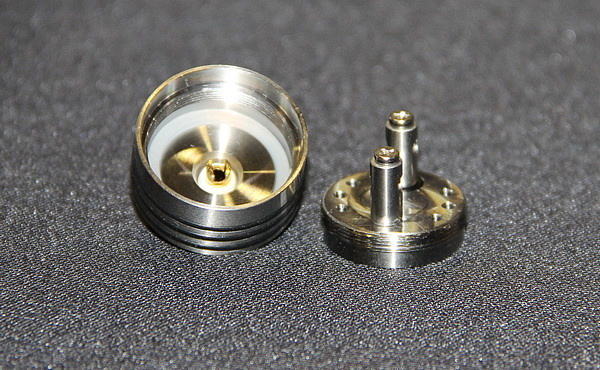 База выкручивается из основания и возможно, в будущем будут представлены сменные перематываемые испарители. Тут установлены две стойки, плюсовая имеет изолятор. В каждой стойке есть по одному отверстию, а сами отверстия не очень большие. Сюда поместятся пара Clapton coil-ов, но о более сложных намотках не стоит и задумываться. Зажимать спиральки будут винты под крестовую отвертку. Базу изрешетили отверстиями для хорошей проводимости жидкости. Выкрутив ее, на основании можем наблюдать плюсовой контакт.