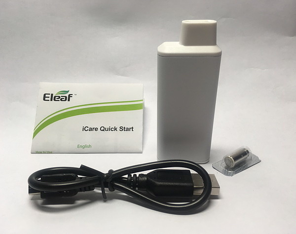 Внутри Упаковки есть набор Eleaf iCare, к нему кабель для зарядки microUSB, инструкция по эксплуатации, в которой присутствует русский язык, и два запасных испарителя.