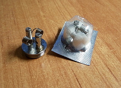 Очень удобно сделана база под спирали. Она является сменной, а в комплекте идет дополнительная и преднамотанная. Очень удобно намотать сразу две базы, а со временем просто выкручивать и использовать новую. База имеет две стойки. Спирали зажимаются винтами под крестовую отвертку. Расстояние между стойками небольшое, да и такое устройство не подойдет к тяжелым и толстым намоткам. Для комфортного и вкусного парения используйте микрокойлы из 0,4 кантала или нержавейки.