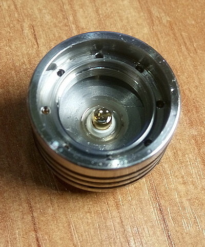 Скрутив базу под спирали, можно наблюдать как выполнена подача жидкости в базе дрип атомайзера. Есть плюсовой контакт с отверстием, а по бокам множество отверстий для подачи жидкости. Тем самым, ватки в Subdrip нужно много. Главное чтобы под спиралями ее не было, а сами спирали были напротив окон обдува, тогда вы сможете получить максимум вкуса от данной дрипки.