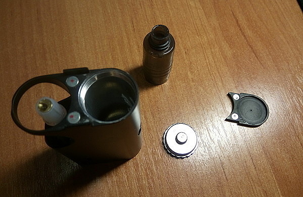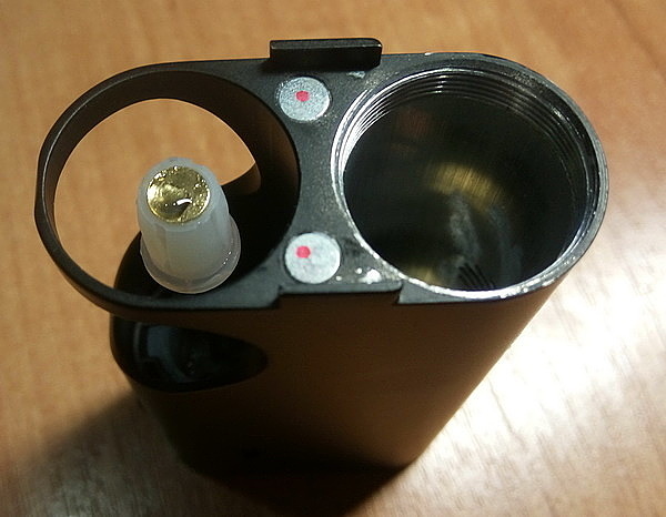 На основании есть отсек под аккумулятор, который закрывается крышкой на резьбе. С задней части есть отверстие для вывода газов.
