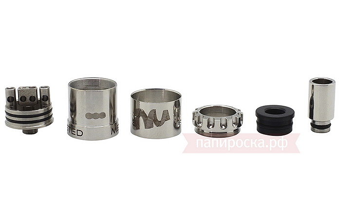 Устройство упаковано в стандартную коробку, внутри которой находятся: атомайзер, топ-кэп, адаптер под 510й дрип-тип вместе с дрип-типом, комплект дополнительных винтов, орингов (уплотнительных колец), шестигранная отвертка.