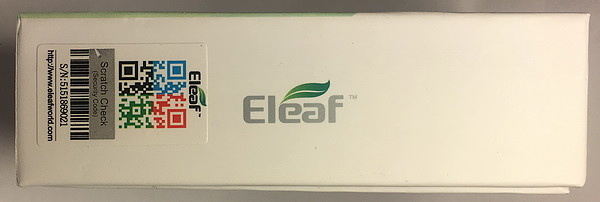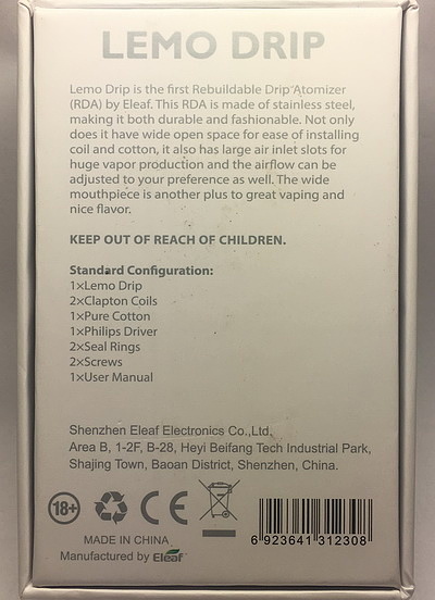 Классическая упаковка Eleaf многим уже наскучившая. На белой коробке изображена дрипка с названием Lemo Drip. С торца есть код, чтобы проверить оригинальность устройства на сайте производителя.