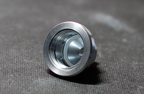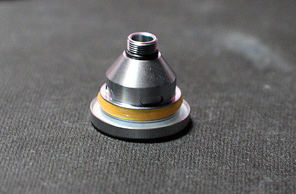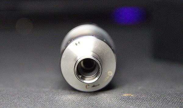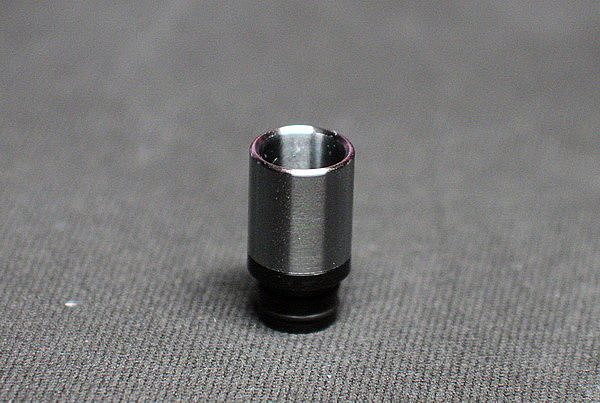 Сверху находится 510 дрип тип. Коннекторная часть выполнена из делрина, а верх корпуса из нержавеющей стали. За счет этого он не передает тепло и остается в цвет корпуса. Дрип тип держится на двух уплотнительных кольцах и уверенно удерживается на крышке бакомайзера. Для того чтобы внутри дрип типа не скапливался конденсат, внутренний диаметр суживается к диаметру шахты.