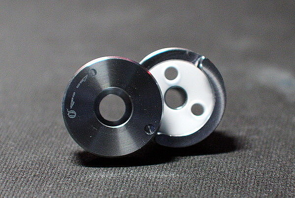 База имеет две стойки. Отверстия для спиралей маленькие, тут даже не стоит думать о толстых намотках типа porncoil. Данный бак рассчитан на спирали сечением в 0,6 мм. Для большего вкуса советую использовать сечение в 0,32 мм и 0,4 мм и диаметром оправы в 2,5 мм. Намотка зажимается при помощи шестигранных винтов, которые расположены по бокам. Вату обрезать заподлицо с окнами подачи жидкости.
