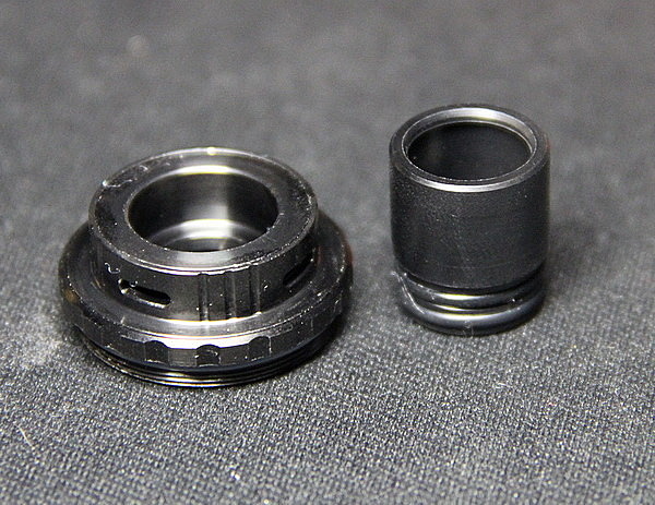 Сверху установлен комплектный широкий делриновый дрип тип. Он отлично справляется с перегретым баком и делает парение комфортным при сложных намотках. Благодаря большому диаметру, увеличивается количество пара, а затяжка становится очень легкой. В комплекте также есть адаптер под 510й дрип тип, который выполнен также из делрина. Оба надежно крепятся на верхней крышке при помощи двух уплотнительных колец. Верхняя крышка комбинированная и имеет дополнительный забор воздуха. Для забора есть четыре отверстия, которые можно перекрывать кольцом регулировки. Удобно, что кольцо имеет стопор в трех положениях. Закрытом, открытом и наполовину закрытом. При переходе в одно из положений слышен щелчок.