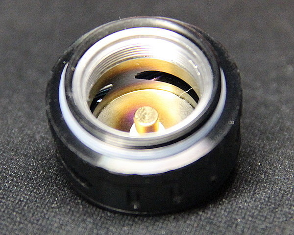 Также верхняя крышка перекрывает окна для заправки бака жидкостью. Для более удобного скручивания есть накатка, а для плотного контакта крышки с корпусом, есть одно уплотнительное кольцо.
