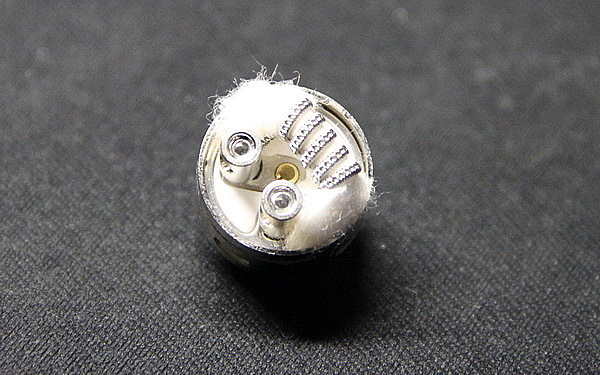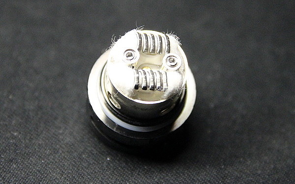 Второй вариант — это база с двумя стойками, расположенными друг от друга симметрично, чтобы можно было устанавливать две спирали. Здесь установлена HBC D04, которая представляет собой два fused clapton, установленными в спэйс (есть расстояние между витками). Сопротивление намотки также 0,2 Ома, производитель рекомендует использовать ее от 40 до 70 Вт, но мне кажется она вытянет и больше. Спирали зажимаются при помощи винтов под шестигранный ключ. И в этом случае я бы тоже вытащил вату и из спэйс сделал бы микрокойл, который даст куда больше вкуса, чем спэйс. В этой базе отверстия обдува куда меньше.