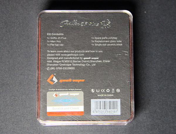 Внутри лежит Griffin 25 Plus, а за обложкой прикрыт огромный комплект запасных частей. В комплекте идет универсальная и очень удобная отвертка тройник, с двумя шестигранными и одной крестовой головкой. Также пакет с запасными уплотнительными кольцами оранжевого и синего цветов, винтами для стоек и адаптером под 510 дрип тип. Еще положили две заглушки для работы с одной спиралью, pyrex стекло и делриновую крышку с мундштуком.