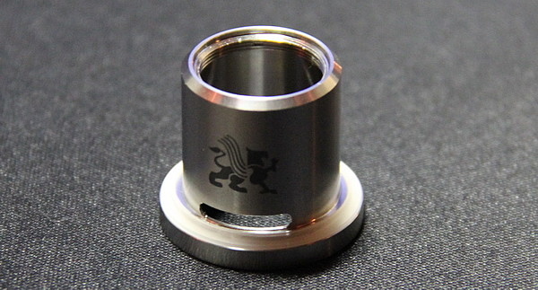 Купол испарительной камеры имеет гравировки с изображение грифона и названием бака. Изменили отверстия для подачи жидкости, под улучшенную на мой взгляд также измененную базу. Теперь вместо четырех отверстий есть два широких симметрично расположенных. В собранном состоянии можно регулировать подачу, вращая тело бакомайзера.