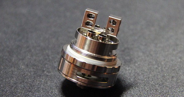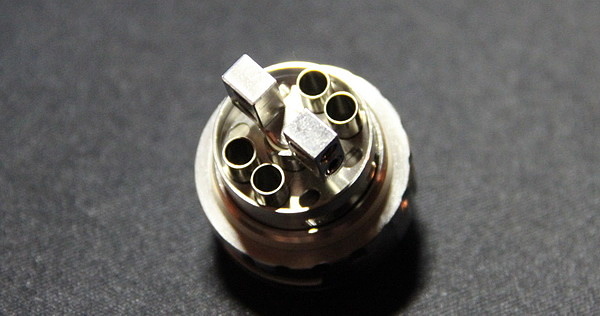 База имеет улучшенные Velocity стойки, в которых проделаны четыре жирных отверстия под любые типы спиралей. Ножки спиралей фиксируются при помощи шестигранных винтов, к сожалению, не прокаленных. И если вы хотите продлить жизнь винтов, то при затягивании не переусердствуйте, дабы не сорвать их. Но как всегда в комплекте идут запасные. Сюда поместятся очень длинные намотки, которые устанавливаются в атомайзеры для дрипа, так как длина между стойками 18,9 мм. Изменили каналы для обдува, теперь есть четыре отверстия как в дрип атомайзере Kennedy. За счет этого обдув увеличился и по сравнению с прошлой версией затяжку будет свободнее на полностью открытых воздуховодах.