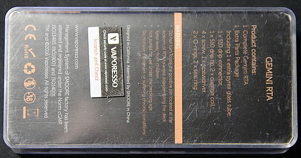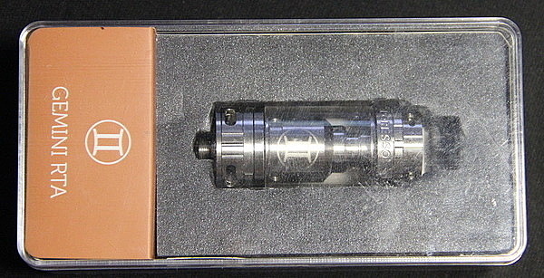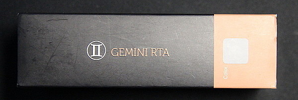 Внешне Gemini RTA напоминает бакомайзер Griffin. Материалом корпуса является нержавеющая сталь. Вес составляет 67 грамм. Высота без учета длины дрип типа 66,5 мм, диаметр 22 мм. Объем вмещаемой жидкости 3,5 мл, что на сегодняшний день считается нормой, для устройств с большой испарительной камерой.