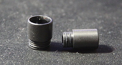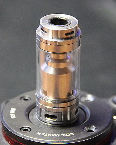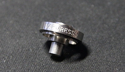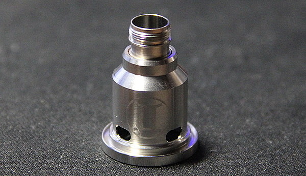 Сверху находится комплектный топ кэп. Он крепится при помощи двух уплотнительных колец, а внутри имеет конусную обработку, чтобы в нем не скапливался конденсат. Также его можно заменить адаптером и 510 дрип типом. Установив адаптер, можно использовать любые 510ые дрип типы. Комплектный имеет два уплотнительных кольца, а внутри есть такая же конусная обработка.
