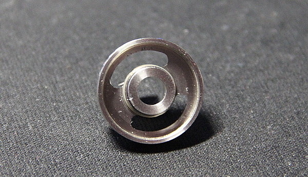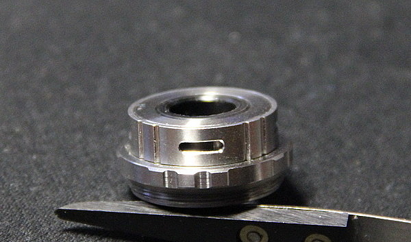 Здесь также есть кольцо для фиксирования ваты. Оно очень помогает при укладке ваты, так как при накручивании корпуса бакомайзера на базу, вата не будет наматываться по резьбе. Для подачи жидкости проделаны большие проточки. Вату нужно укладывать в отверстия, которые создает кольцо. Не стоит наваливать огромное количество ваты и укладывать по всей длине проточки. При такой укладке вы стопроцентно получите гарик, из-за плохой пропитываемости ваты жидкостью. Для более удобного скручивания базы есть накатка.