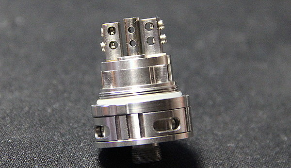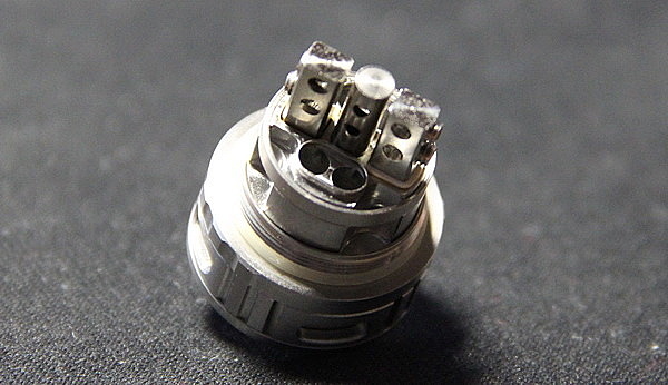 Отверстия в стойках позволяют творчески подойти к установке намоток, а фиксируются они при помощи шестигранных винтов. С данными шестигранными винтами стоит быть аккуратнее. Затягивать и контрить намотку нужно плавно, чтобы случайно не сорвать шестигранник. Также в бакомайзере присутствует нижний вкусовой обдув. Для обдува проделаны четыре огромных отверстия. Для получения большего вкуса следует опускать спираль как можно ближе к отверстиям обдува. База очень похожа на базу Griffin.
