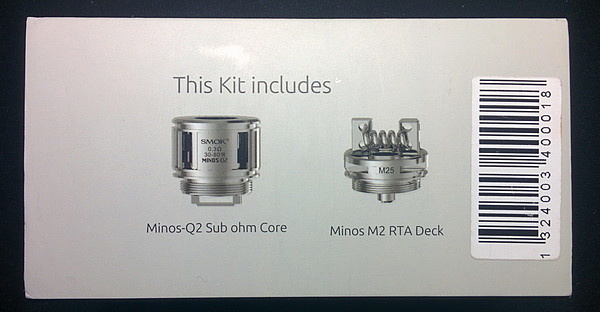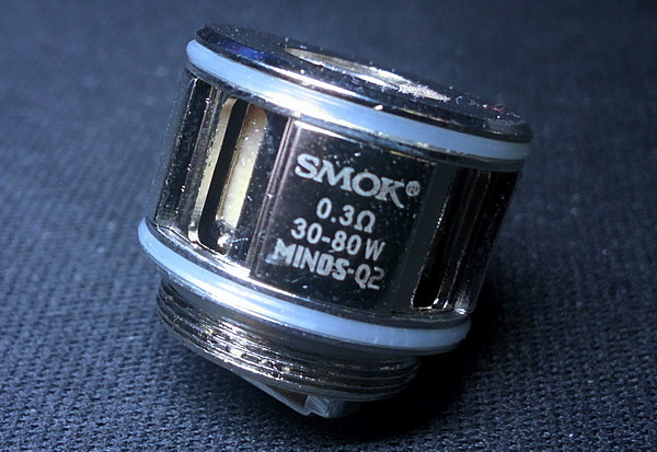 В комплекте идет сменный испаритель Minos Q2 Core. На корпусе испарителя изображено название, сопротивление и рабочий диапазон мощности. В данном испарителе сопротивление 0,3 Ома, а производитель рекомендует использовать его от 30 Вт до 80 Вт. Испаритель имеет большие отверстие для забора жидкости и без проблем справляется с густыми замесами, как 70 VG на 30 PG. И как мы знаем компания SMOK известна большим количеством разных испарителей к своему устройству, но либо данный бак они обошли стороной, либо я уже не доглядел что-то. Хотя на официальном сайте никакой дополнительной информации нет.