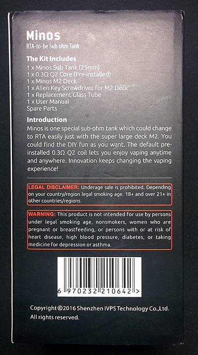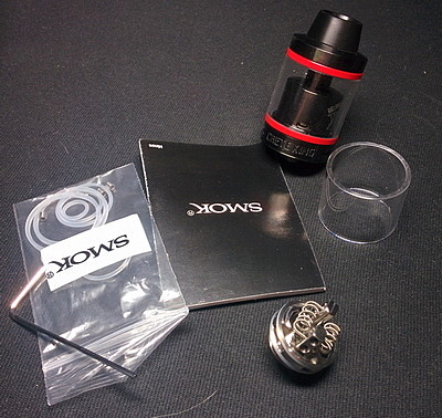 Внутри коробки лежит сам бакомайзер SMOK Minos Sub Tank. Под ним находятся инструкция по использованию, только на английском языке, но благодаря обилию картинок, и не зная языка можно разобраться что к чему. Пакет с запасными уплотнительными кольцами и винтами для стоек сменной RBA базы, запасное pyrex стекло, шестигранный ключ и обслуживаемая база. Внутри бакомайзера установлен сменный испаритель.