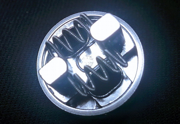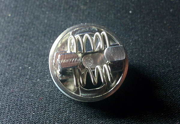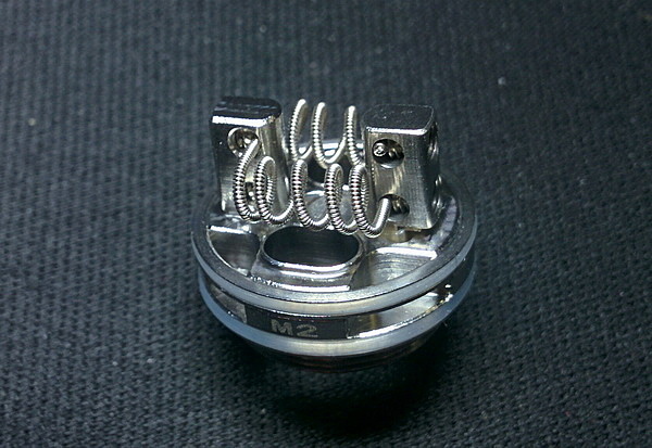 Обслуживаемая база имеет velocity стойки и отвратительные, на мой взгляд, преднамотанные спирали. База называется M2 RTA Deck. Стойки выполнены хорошо, как и сама база. Есть четыре небольшие проточки под укладку ваты. Преднамотанные спирали же выполнены спэйс койлом (расстояние между витками) и имеет сопротивление в 0,3 Ома. Внутри как жила используется фехраль, а обмотан он нихромом. Сам материал выбран отлично, а сама намотка ужасна. Так как база позволяет, советую ставить сюда всем любимые fused Clapton, причем материал лучше брать такой же. Фехраль в жилу, а вокруг нихромом. И тогда уже с этой намоткой бак покажет себя на максимум своих вкусовых возможностей.