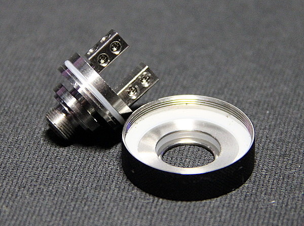 Для того чтобы добраться до базы, необходимо скрутить основание бакомайзера, которое также имеет накатку. Скрутив кольцо, можно достать базу. Скорее всего будут разные виды баз, которые будут иметь другие стойки. База устанавливается в среднюю часть корпуса и ставится туда в пазы. Тем самым фиксируется по часовой стрелке, зажимаясь далее основанием. База имеет классические удобные всем Velocity стойки: минусовая стойка монолитна с корпусом, а плюсовая смещена относительно центра и имеет изоляционную проставку. Отверстия для установки спиралей приличные, сюда без проблем встанет спиралька типа fused Clapton, и она как раз будет отлично раскрывать вкус бачка. У основания есть небольшая ванночка и четыре маленьких отверстия для подачи жидкости. Тем самым ватку сюда следует укладывать так, чтобы перекрыть эти отверстия. Для того чтобы комфортно можно было установить спираль, нужно базу вставить в основание и установить собранное на устройство для прожига и далее работать с базой.