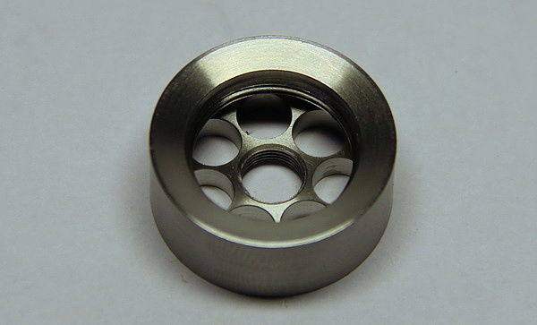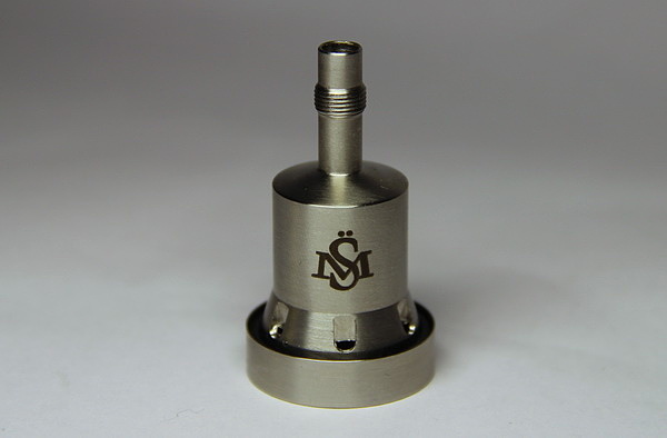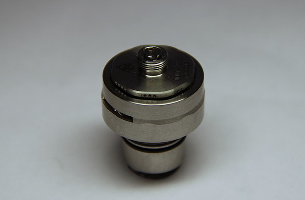 На шахте проделана резьба, куда и накручивается верхняя часть. Шахта монолитна с куполом испарительной камеры, на корпусе которого нанесена гравировка с логотипом SvoeMesto, и есть шесть отверстий для подачи жидкости в испарительную камеру. В собранном состоянии, максимально закрутив корпус на базу, подача жидкости перекрыта. Для того чтобы понять, насколько нужно откручивать корпус, чтобы подача жидкости была оптимальной, следует постепенно откручивать корпус, пока не пойдут пузыри воздуха. При густых жидкостях следует открывать еще чуть больше. То есть в момент заправки нужно до конца закрутить корпус, после чего заправить бак, закрутить верхнюю крышку и постепенно откручивать корпус с базы, пока не пойдут пузыри воздуха. Именно они будут указывать на то, что жидкость поступает к вате. Ход в откручивании большой, так что корпус все равно остается монолитным и не шатается.