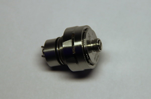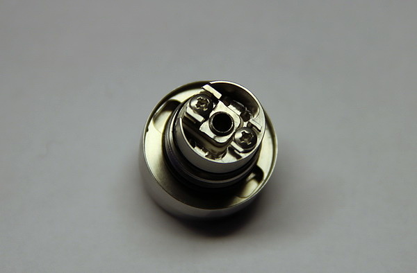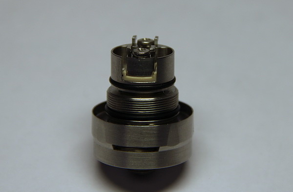 База устройства стала еще проще. Увеличилось отверстие обдува спирали, оно все также одно и находится по центру базы. Есть две стойки, плюсовая с изоляционной проставкой и минусовая, монолитна с корпусом. Спирали в данном баке закручиваются при помощи крестовых винтов. К сожалению, углубление в шляпке под отвертку не очень глубокое и при затягивании винтов, следует быть осторожным, чтобы не сорвать шляпку.
