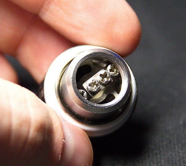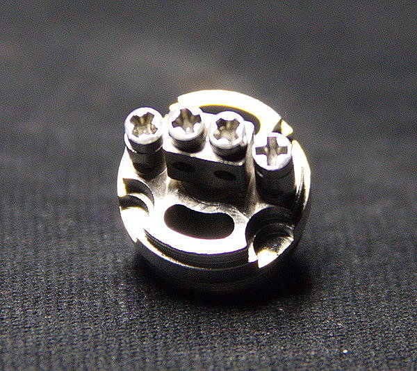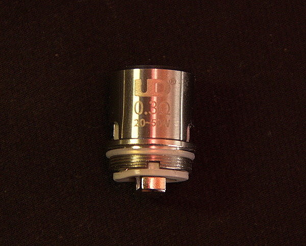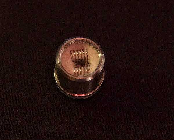Комплектный сменный испаритель выполнен из кантала и имеет сопротивление в 0,3 Ома. На корпусе есть гравировка, обозначающая в каком диапазоне мощностей можно использовать данный испаритель. В данном случае от 20 до 50 Вт. На испарителе есть четыре больших отверстия для подачи жидкости, так что его без проблем можно использовать с большим процентом VG в жидкости.
