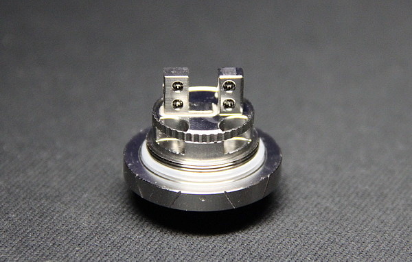База имеет классические Velocity стойки с большими отверстиями для спиралей в стойках. Они большие, а не огромные. И сюда легко поместятся такие типы спиралей как Fused Clapton. Для фиксации спиралей есть шестигранные винты, а для удобной укладки ваты сделаны четыре большие проточки. Данный бакомайзер не получится использовать в режиме одной спирали. Для лучшего контроля ваты есть фиксирующее кольцо с накаткой. Ниже также есть накатка для удобного скручивания базы с корпуса и имеется точка.