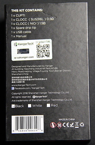 Упаковка имеет классический черно-красный цвет (черный цвет устройства) и выполнена в виде книжки. Крышка упаковки держится на магнитах, что-что. а упаковки у Kangertech всегда на высоте. На передней стороне изображен набор Cupti TC, по бокам имя производителя. На основании описание комплектации и конечно код оригинальности, содрав который нужно вбить на сайте производителя, тем самым убедиться в подлинности продукта. На дне также присутствуют сертификаты качества и галочкой указан выбранный цвет. Набор выпускается в трех цветах: черный, белый и красный.