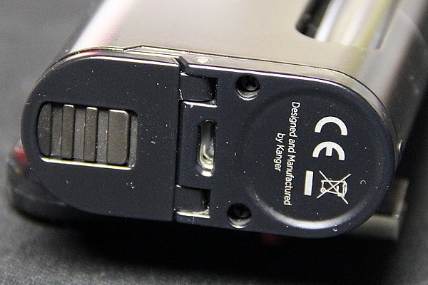 На основании есть отверстие для зарядки устройства micro USB, также боксмод можно использовать во время зарядки, к сожалению, не без вреда для вашего аккумулятора. Рядом расположен отсек под аккумуляторы, который защелкивается крышкой. Открыть ее можно передвинув, ползунок. Аккумулятор устанавливается плюсом вверх (к экрану).