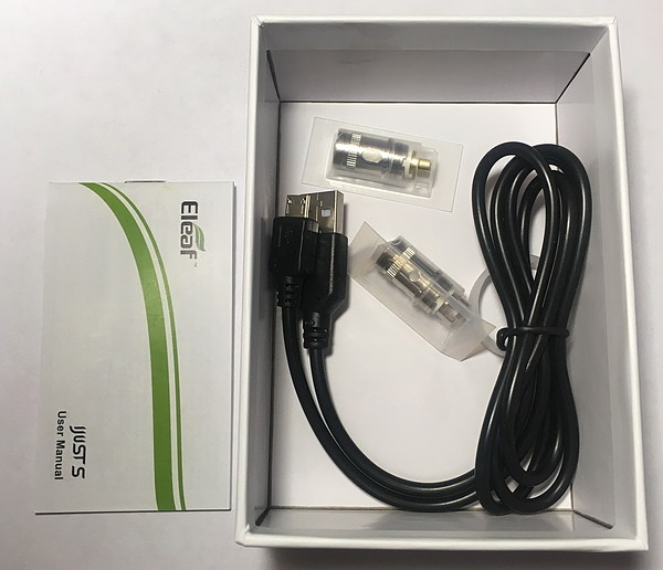 В комплектацию коробки входит набор iJust S, кабель для зарядки устройства, два запасных сменных испарителя, силиконовое кольцо для регулировки затяжки и инструкция к эксплуатации.