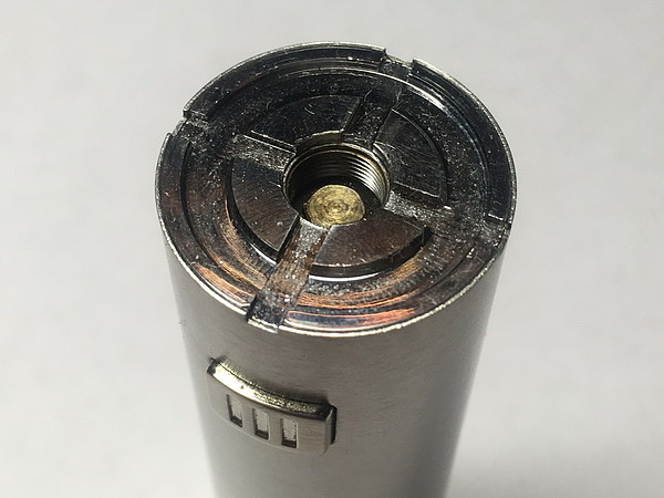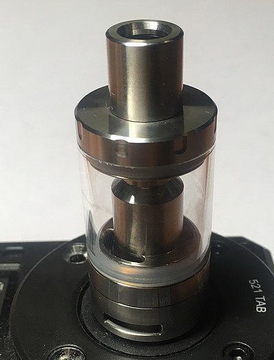 Сверху находится 510 стальной коннектор и подпружиненный контакт, что дает возможность накрутить сюда любой атомайзер диаметром в 24 мм. Многие используют данный блок в дрип атомайзером Goon RDA. Очень важно соблюдать минимальное сопротивление блока, которое составляет 0,18 Ом.